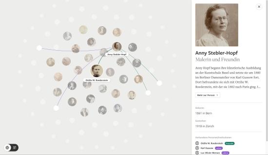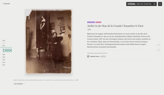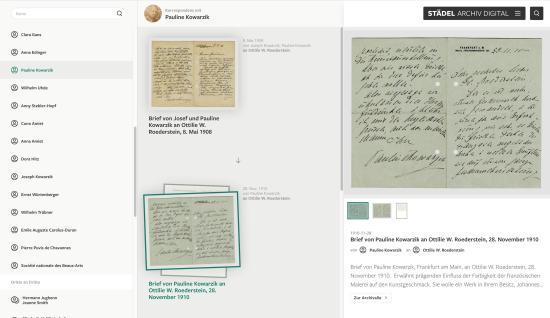 Nur selten sind Nachlässe von Künstlerinnen in diesem Umfang erhalten. Das außergewöhnliche Archivkonvolut wurde dem Städel Museum 2019 als großzügige Schenkung aus Privatbesitz übergeben. Es umfasst rund 1.000 Briefe, über 3.000 historische Fotografien und Werkreproduktionen sowie weitere Dokumente wie Ausstellungsbesprechungen oder Presseartikel. Für die Präsentation dieses einzigartigen Bestands wurde – angelehnt an die modulare Struktur der Digitalen Sammlung des Städel Museums – ein innovatives Online-Format entwickelt, in dessen Zentrum die dynamische Visualisierung des weitverzweigten Netzwerks der Künstlerin Ottilie Roederstein steht. Interaktive Such- und Filterfunktionen machen eine repräsentative Auswahl von über 1.000 Text- und Bilddokumenten aus dem Nachlass zugänglich. Sie ermöglichen es, das Material gezielt nach Themen, Orten oder Personen zu durchsuchen und die bewegenden Geschichten um Roederstein anhand der Archivalien nachzuvollziehen. Ergänzt wird das Angebot durch eine interaktive und bebilderte Chronologie ihres Lebens und Schaffens.